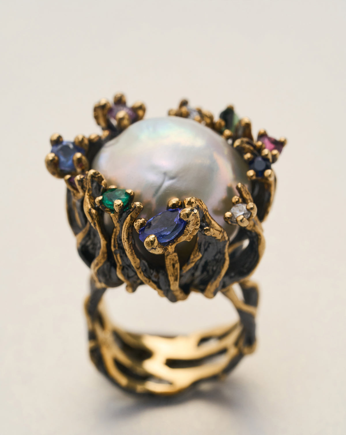 made of gold vermeil, covered with black rhodium, and set with sapphires, tourmalines and diamonds.
