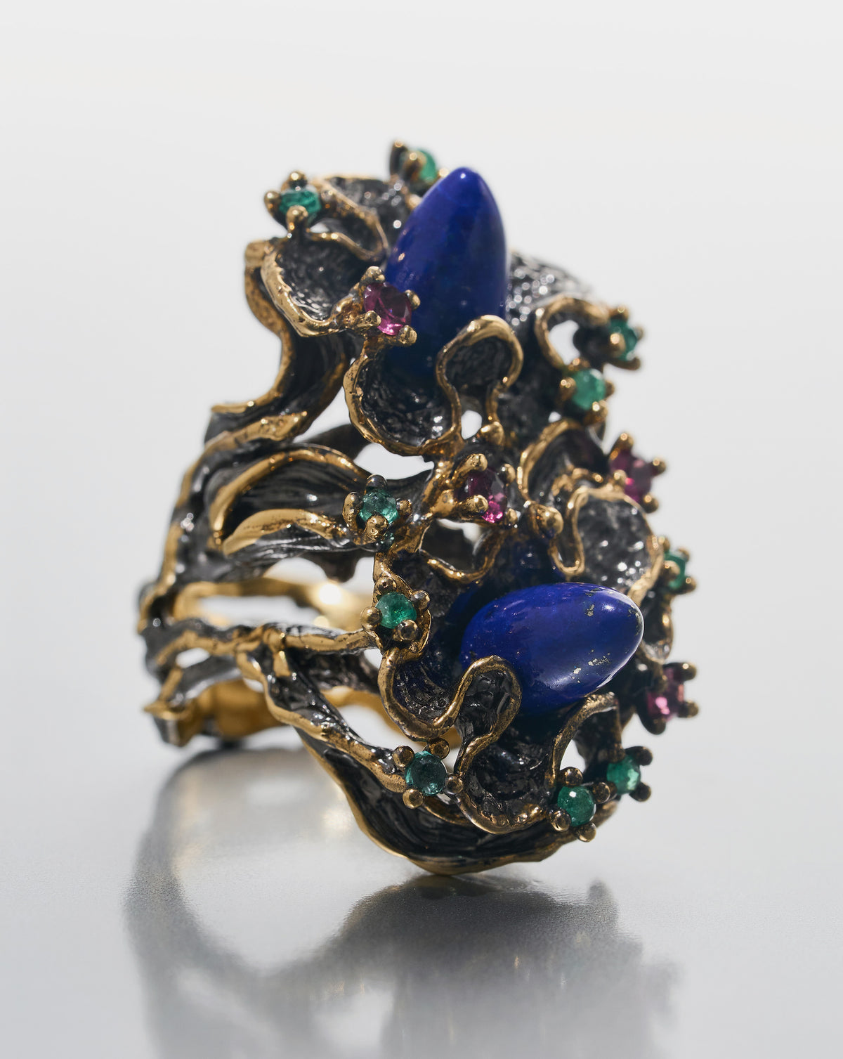 made of gold vermeil, covered with black rhodium, and set with lapis, tourmalines, emeralds.