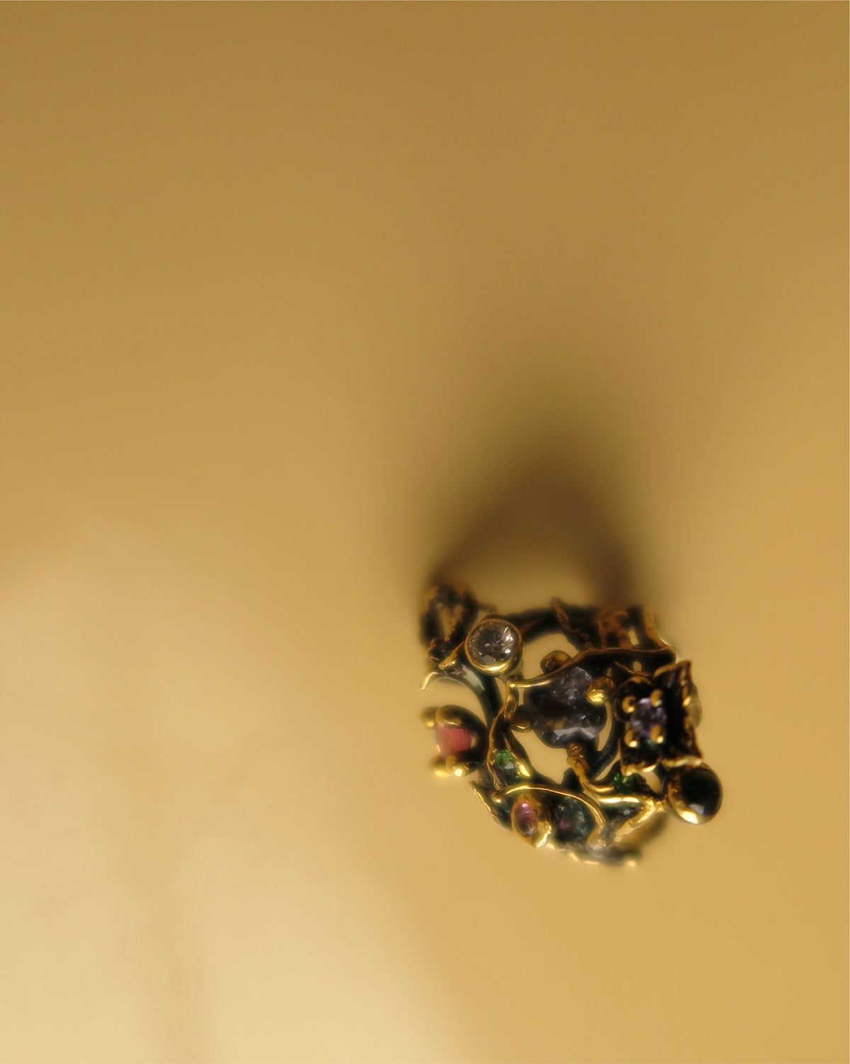 made of gold vermeil and black rhodium, set with Tanzanite, Diamonds, Emeralds, and Tourmalines.