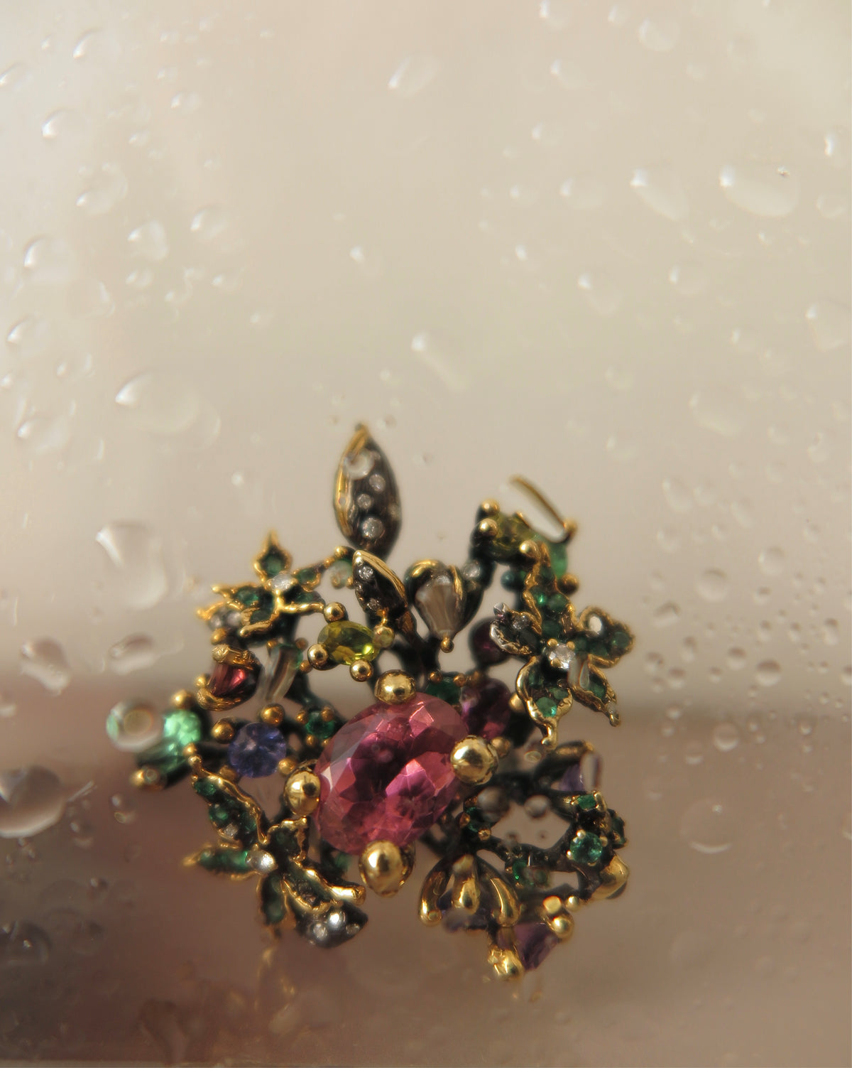 made of gold vermeil and black rhodium, set with Tourmaline, Emeralds, Tanzanite, Yellow Sapphire and Diamonds.