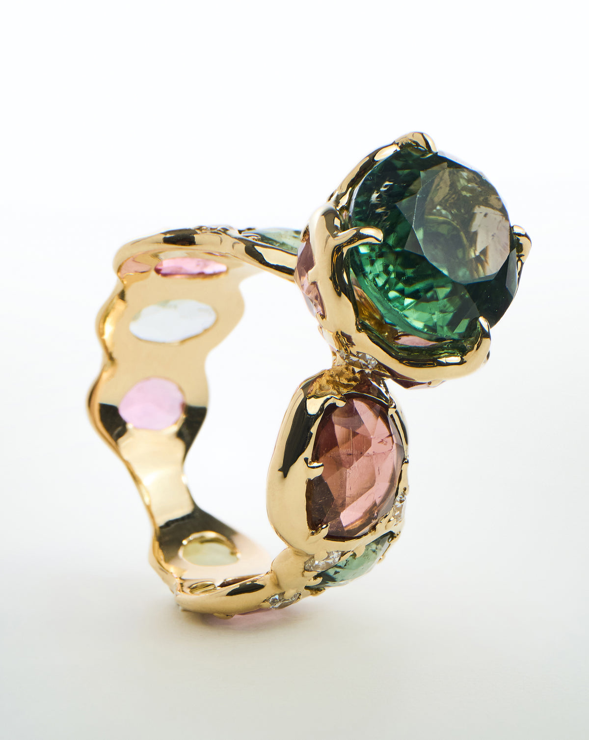 made of 14k gold and set with a verdelite, bicolor tourmalines, diamonds.