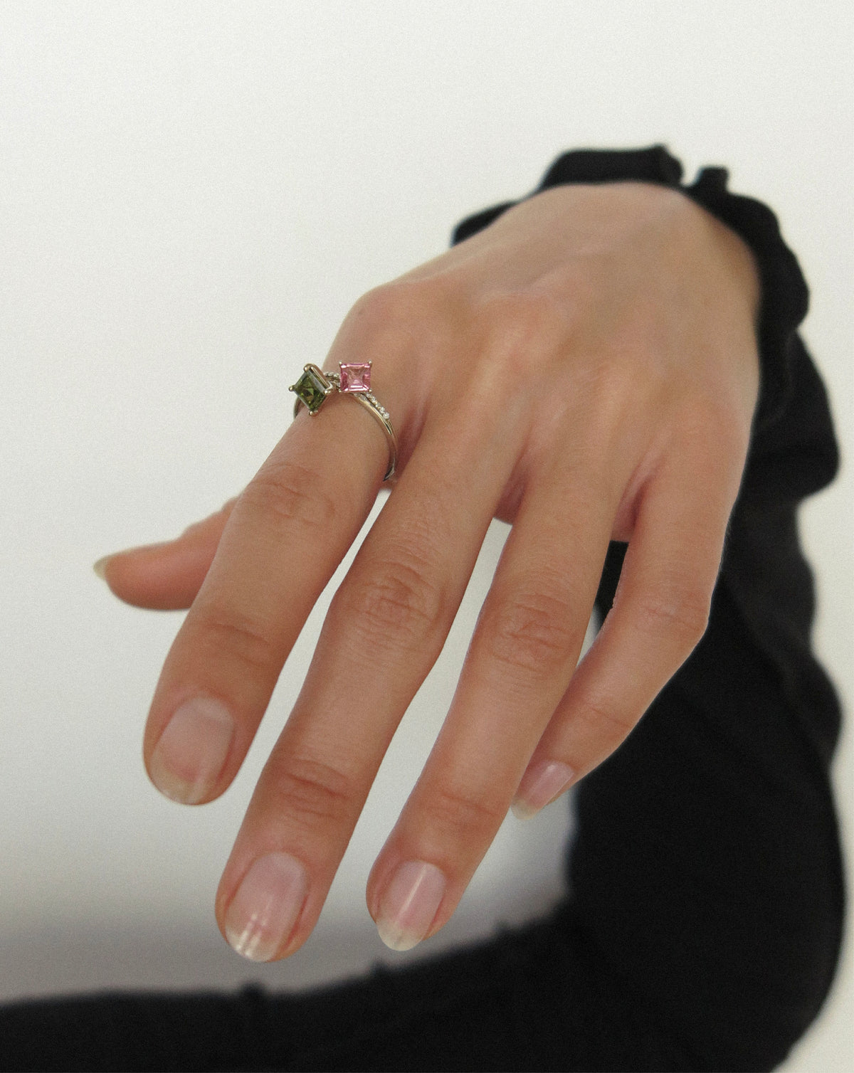 у парі з рожевим він стає діалогом. зелений утримує — рожевий відкриває. дві сторони ніжності, що обертаються. дрібні Діаманти — як розділові знаки — роблять цю турботу видимою.