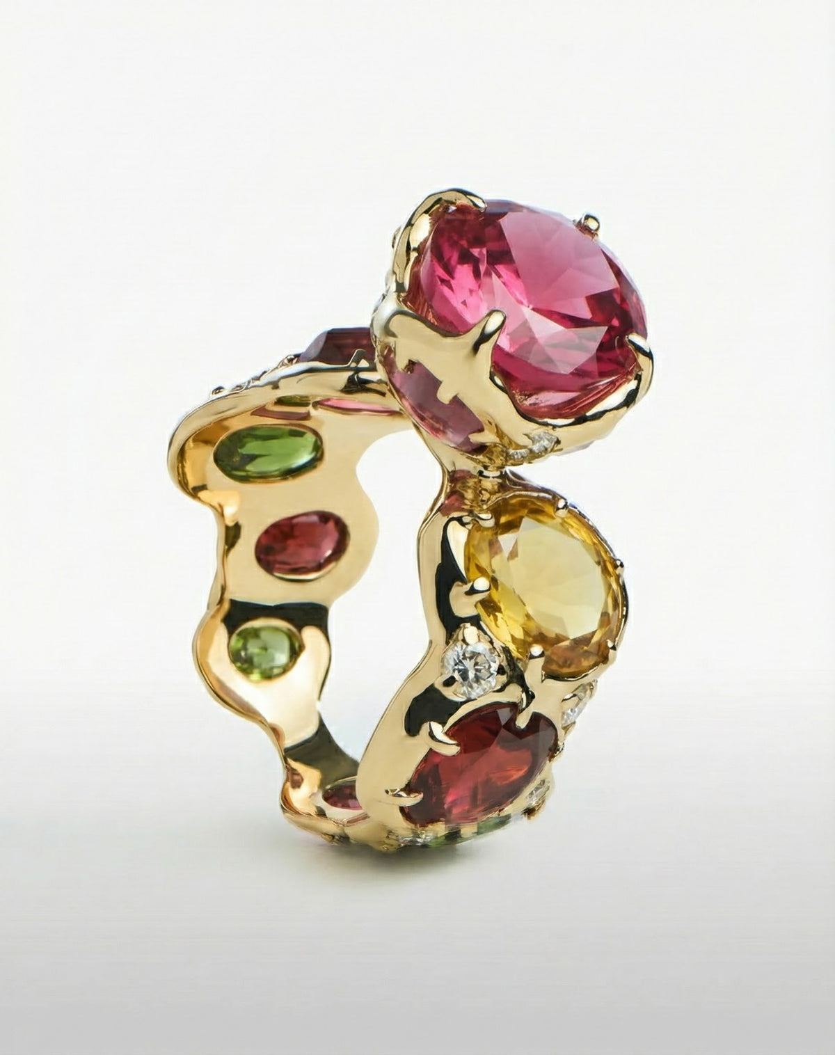 виготовлений із золота 585 проби, оправлений рубелітом, кольоровымы турмалінами, діамантами.